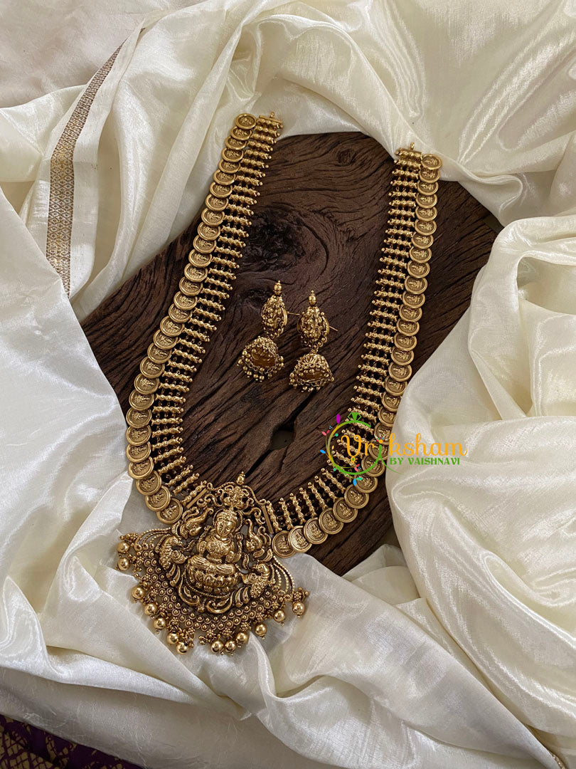 Premium Coin Style Lakshmi Haram -Temple Haram-Gold Bead -Lakshmi and peacock idols arranged in linear fashion and layered with ad stone coin, comes with matching earrings.