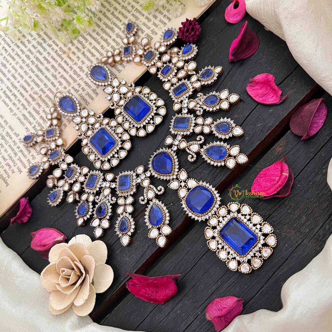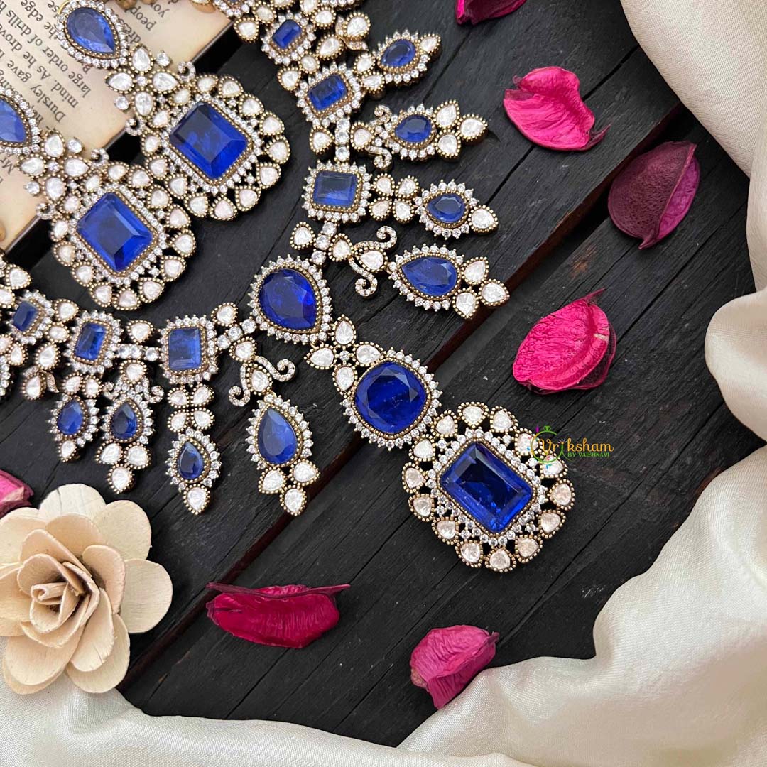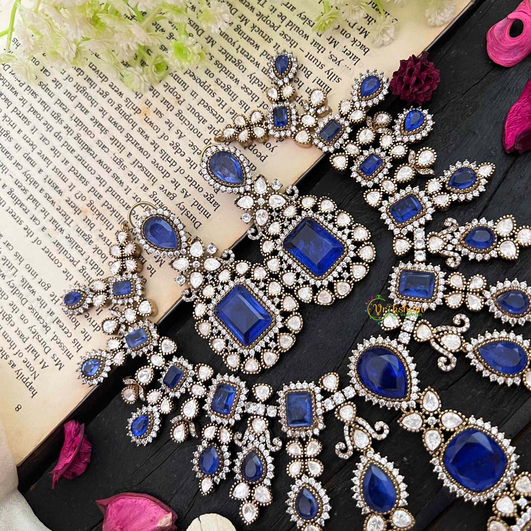 Premium Dark Bule Victorian Diamond Short Pendant Neckpiece -The Victorian diamond pendant necklace is a mesmerizing embodiment of the era's romance and elegance. Featuring a stunning diamond centerpiece, delicately framed by intricate filigree work and ornate detailing, this necklace exudes opulence and refinement ;comes with matching earrings.