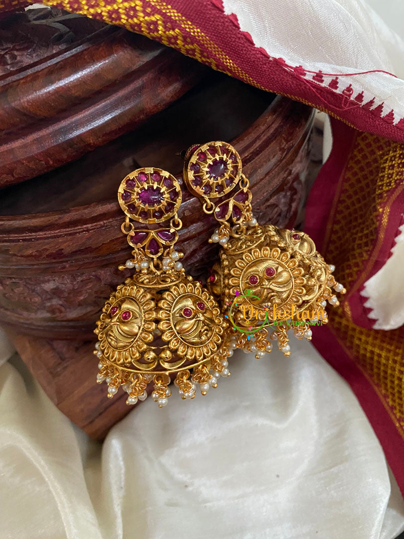 Premium Floral AD Stone Jhumkas – Red AD stone; Floral and Sun Pattern; pearl finish.