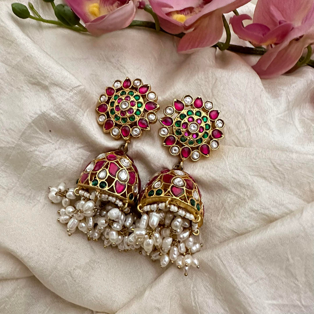 Elevate your look with our exquisite Premium Floral Jadau Kundan Jhumkas-Rice Pearl. These jhumkas feature intricate floral design and stunning rice pearls, adding a touch of elegance to any outfit. Elevate your style with these premium quality jhumkas and make a statement wherever you go! The back screw design ensures a secure and comfortable fit.