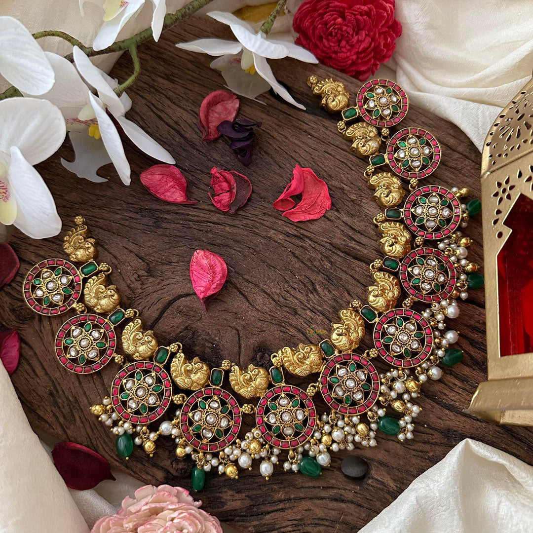 Indulge in luxury with our Premium Floral Jadau Kundan Peacock Neckpiece. Crafted with intricate details and adorned with lustrous pearls and emerald green beads, this exquisite piece exudes elegance and sophistication. Elevate your style and make a statement with this unique and exclusive design.