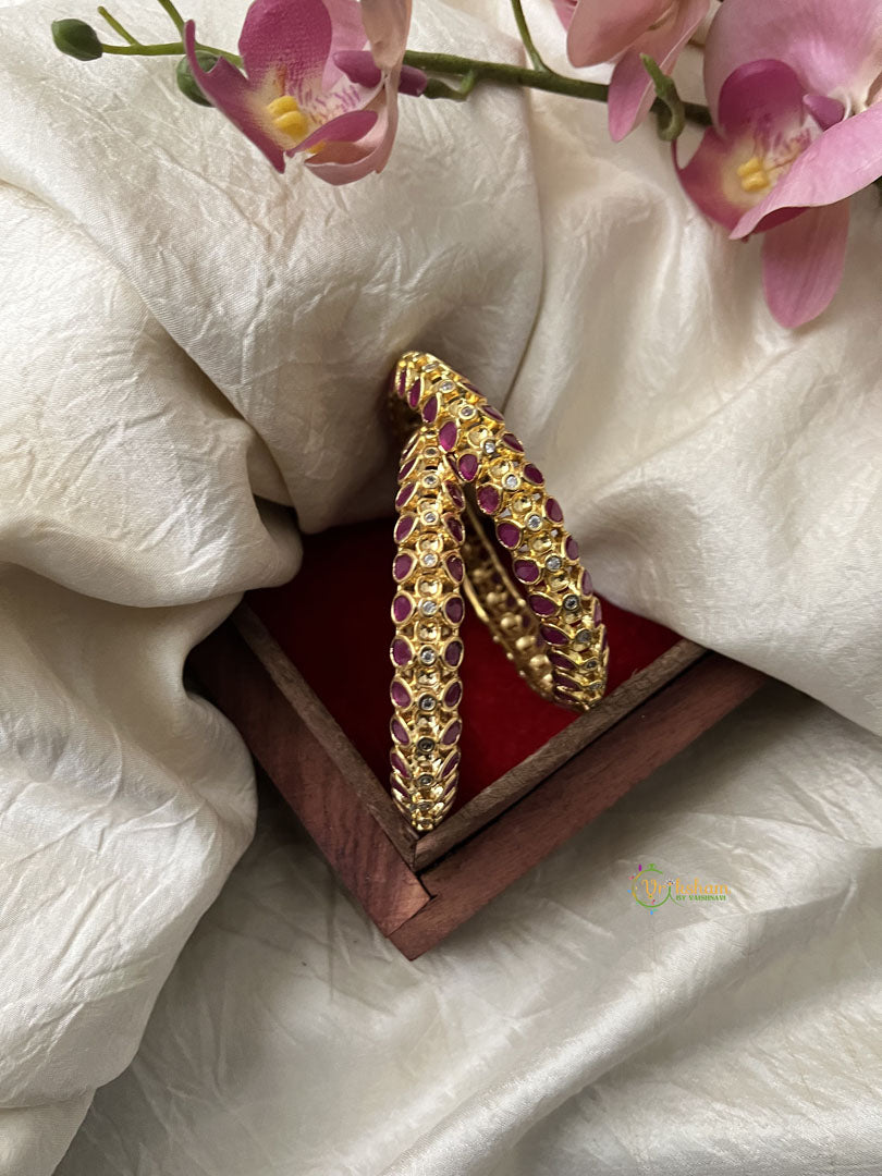 Premium Gold Alike Antique Diamond Bangle Set - White & Pink - AD Stone Studded festive Bangles set. comes as pair only.