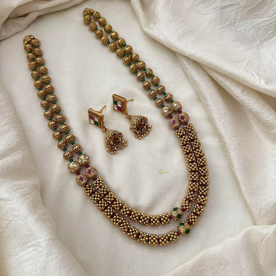 Elevate your look with our Premium Gold Alike Beaded Malai. With two luxurious layers adorned in striking red and green beadwork, this malai exudes sophistication. Complete the ensemble with the included matching jhumkas for a truly exclusive touch. Elevate your style and stand out from the crowd.