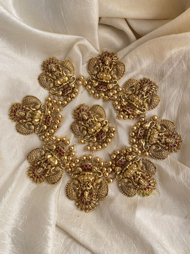 Premium Gold Look Alike Dual Peacock Lakshmi Jada Billai - 9 pieces of same size temple billai - Gold Alike Dual Peacock and Dual Elephant with one Lakshmi in center and touch of red non precious kemp stone Jada Billai likely refers to decorative hair ornaments, specifically designed to adorn the hair in traditional Indian styles, such as for classical dance performances or special occasions like weddings.