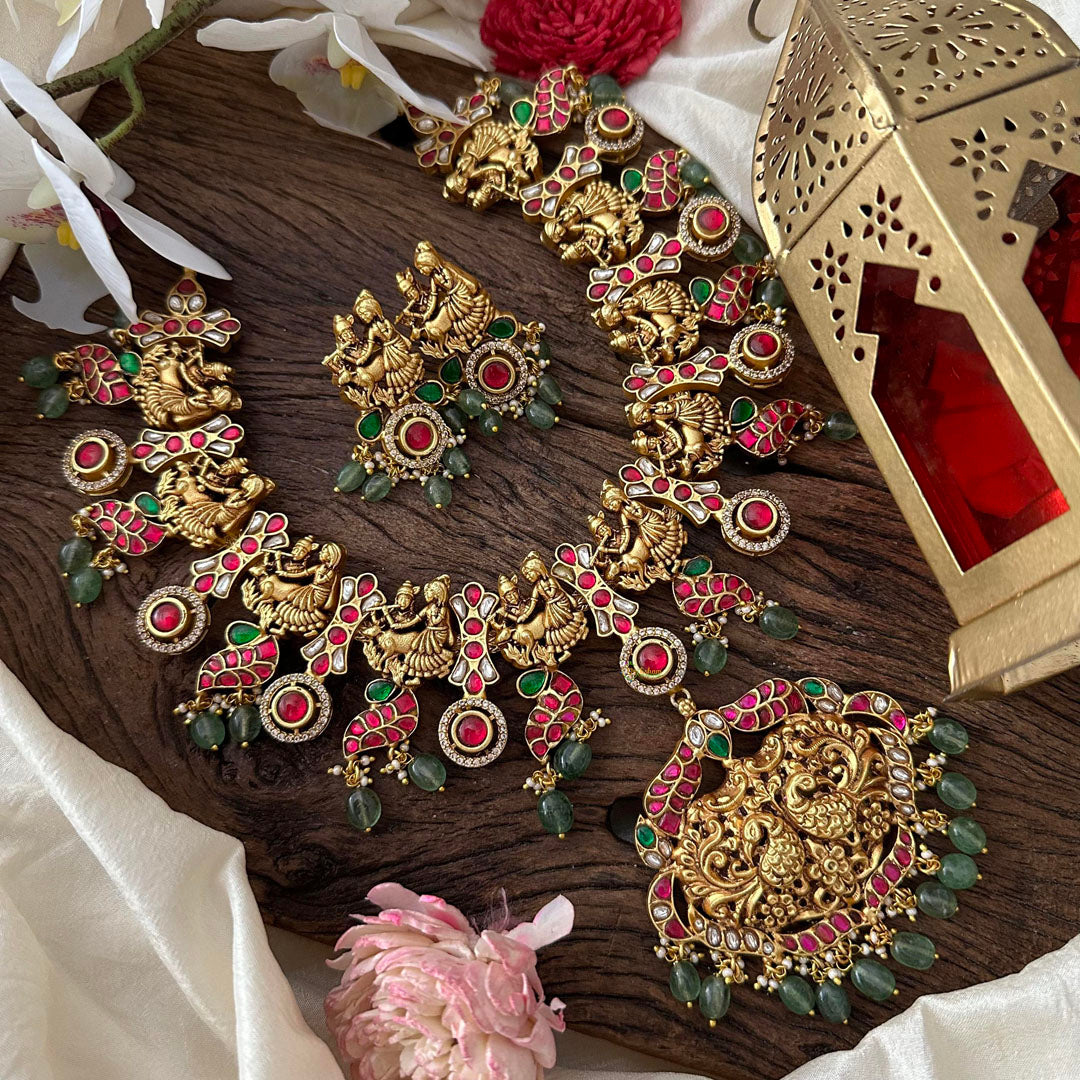 Elevate your style with our Premium Gold Alike Jadau Kundan Radha Krishna Neckpiece. Handcrafted with intricate detailing and adorned with pearls and beads, this luxurious statement piece adds a touch of elegance to any outfit. Embrace the exclusivity and elegance of this timeless accessory.