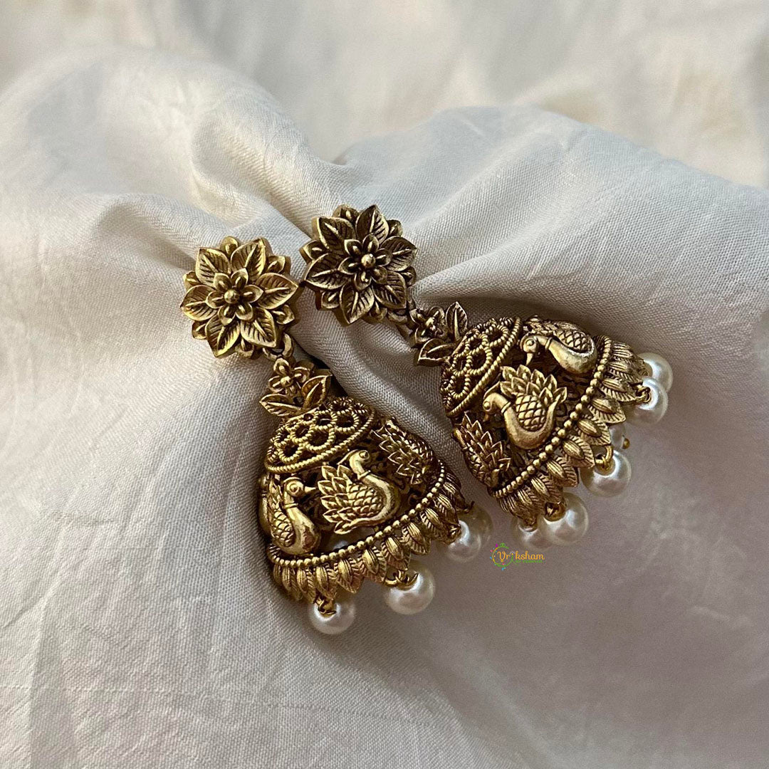 Add a touch of elegance to any outfit with our Premium Gold Alike Peacock Jhumkas-Pearls. These unique earrings feature delicate peacock designs and shimmering pearls, making them perfect for special occasions or everyday wear. Elevate your style with these stunning jhumkas.