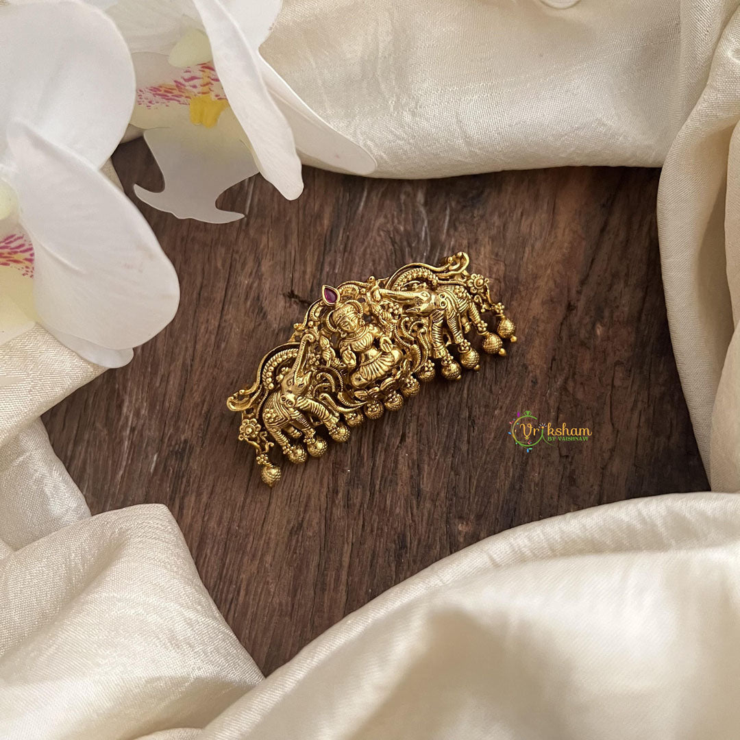 Indulge in luxury with our Premium Gold Look Alike Hair clip featuring the regal Lakshmi and majestic elephant design. Crafted with intricate details, this accessory exudes sophistication and elegance. Elevate any look with this exclusive piece, perfect for a fashionable and timeless addition to your collection.