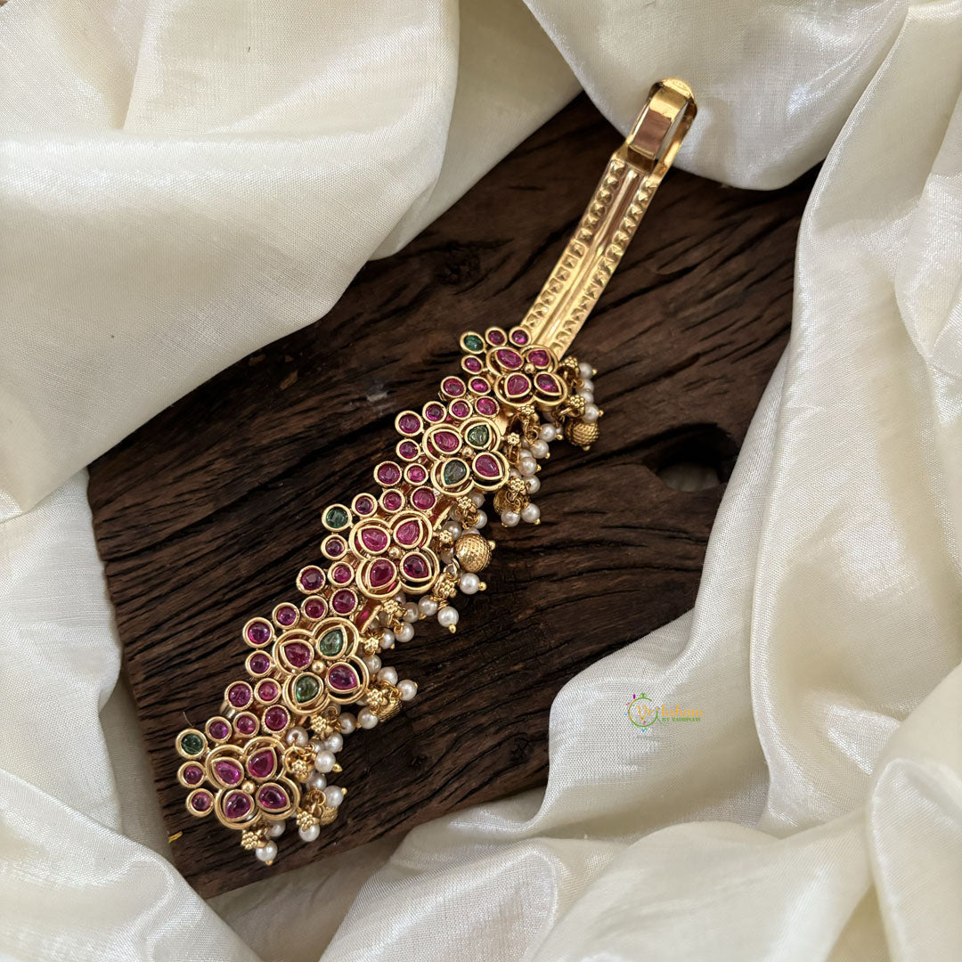 Premium Gold Look Alike Hair clip -Red and Green Stone -Gold Bead hair clip for festive braids and hairstyling.