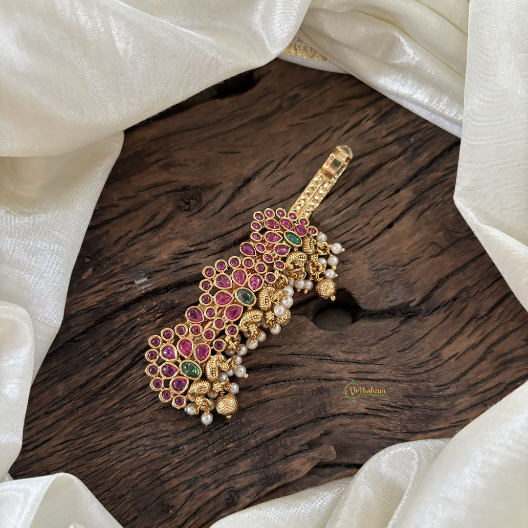 Premium Gold Look Alike Hair clip -Pearl-Red Green hair clip for festive braids and hairstyling. Make material:Premium Gold Look Alike Hair clip is made of Temple make, Copper and brass...