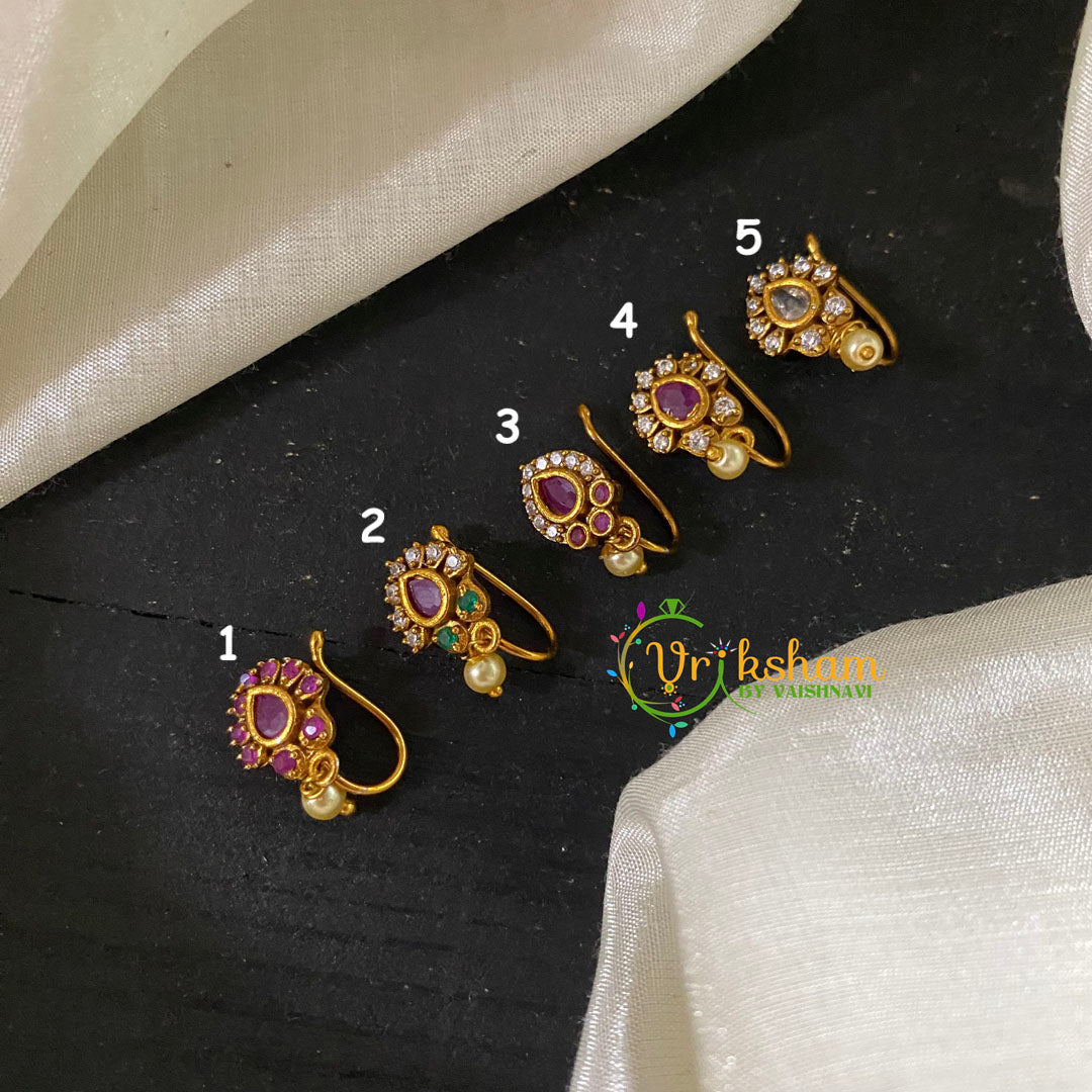 Premium Gold Nath / Nose pin ( Non Pierced Nose pins); Complete AD Stone studded clip on type nosepin. MAKE MATERIAL –Gold Nath , Gold Look alike polish, imitation stones,...