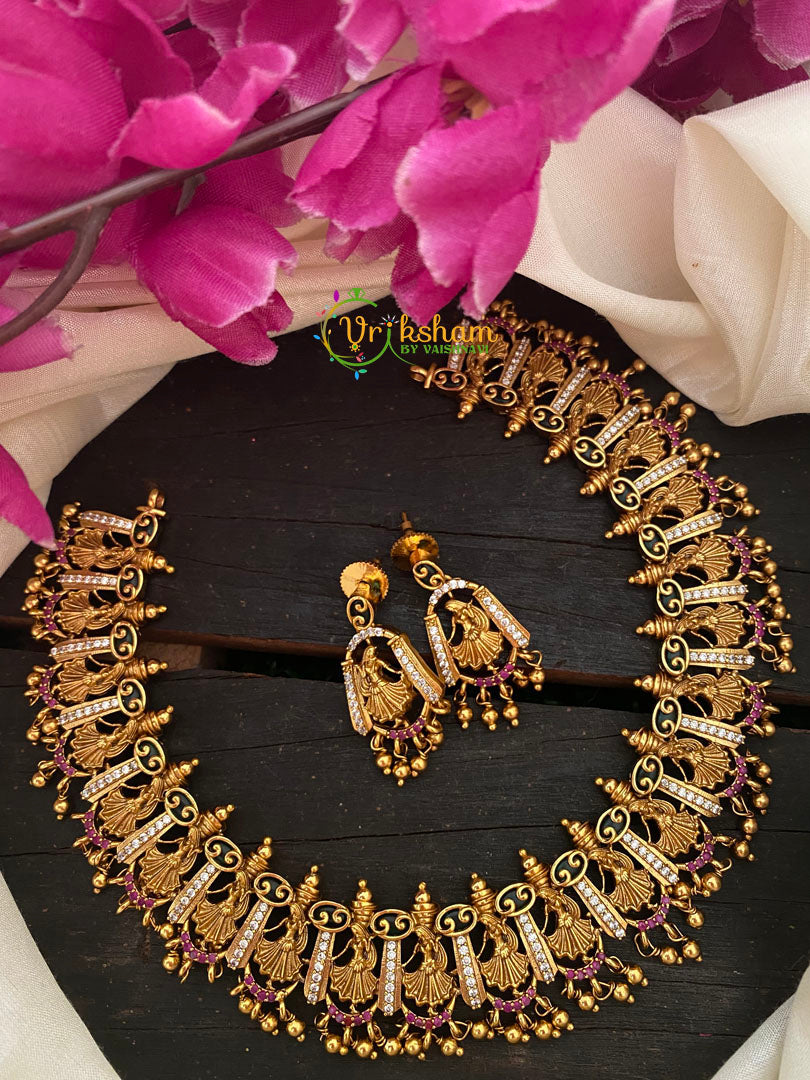 Premium Gold Short Neckpiece -Dancing Girls with pink and white ad stone studded Comes with matching dangler; ghungroo finish.