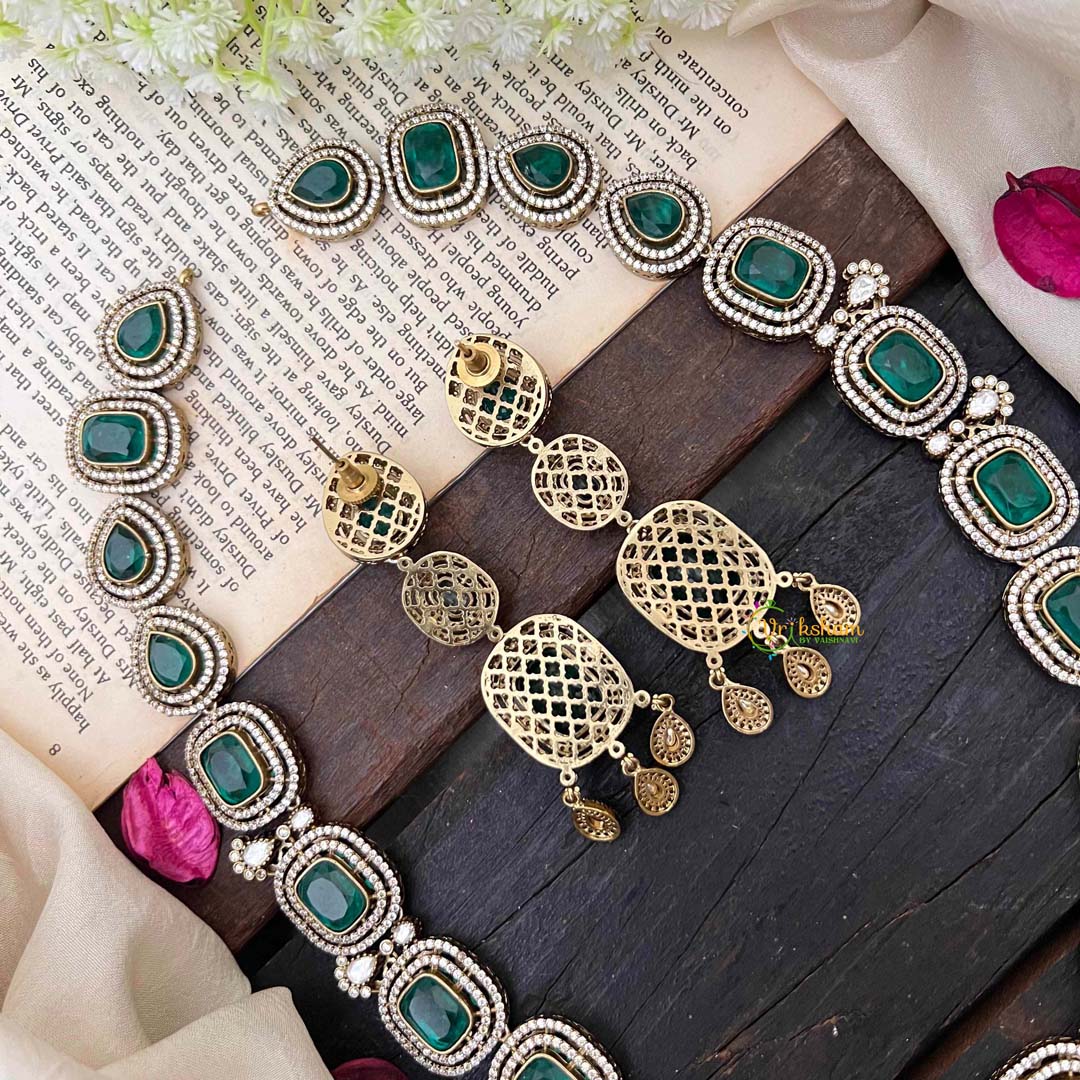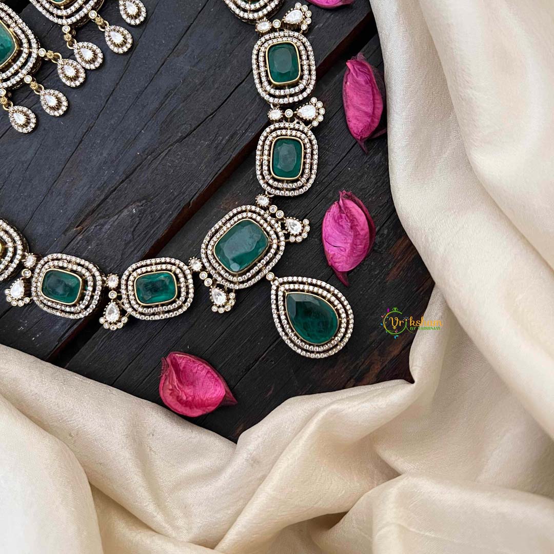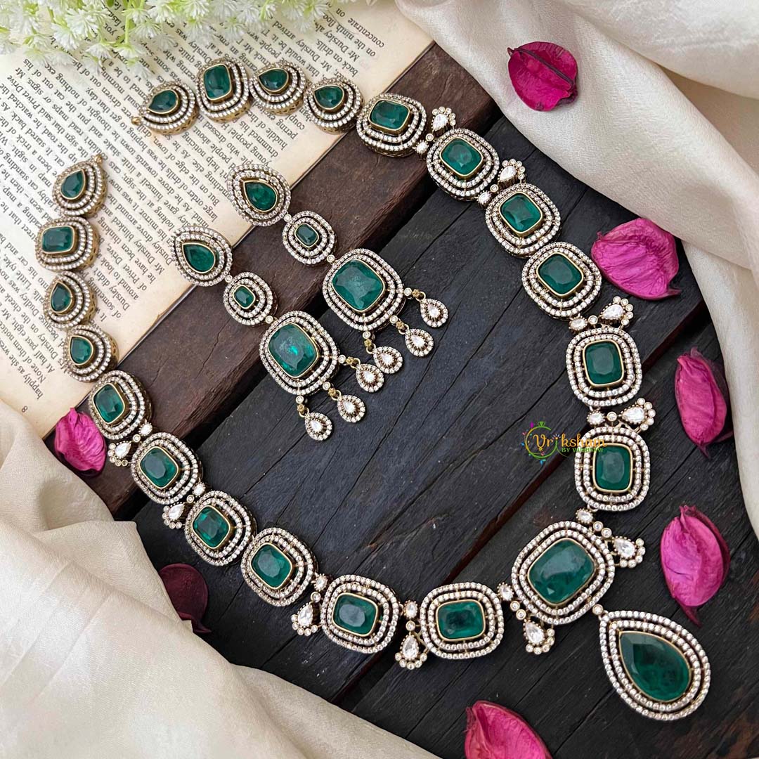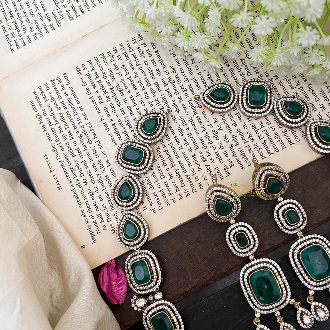 Premium Green Victorian Diamond Pendant Neckpiece - Adorned with exquisite purple and intricate detailing, our bridal jewelry is a tribute to the grace and sophistication of bygone times. From ornate necklaces to delicate earrings and enchanting tiaras, every piece is crafted to perfection, making it the perfect accompaniment to your special day ; comes with pair of matching earring.