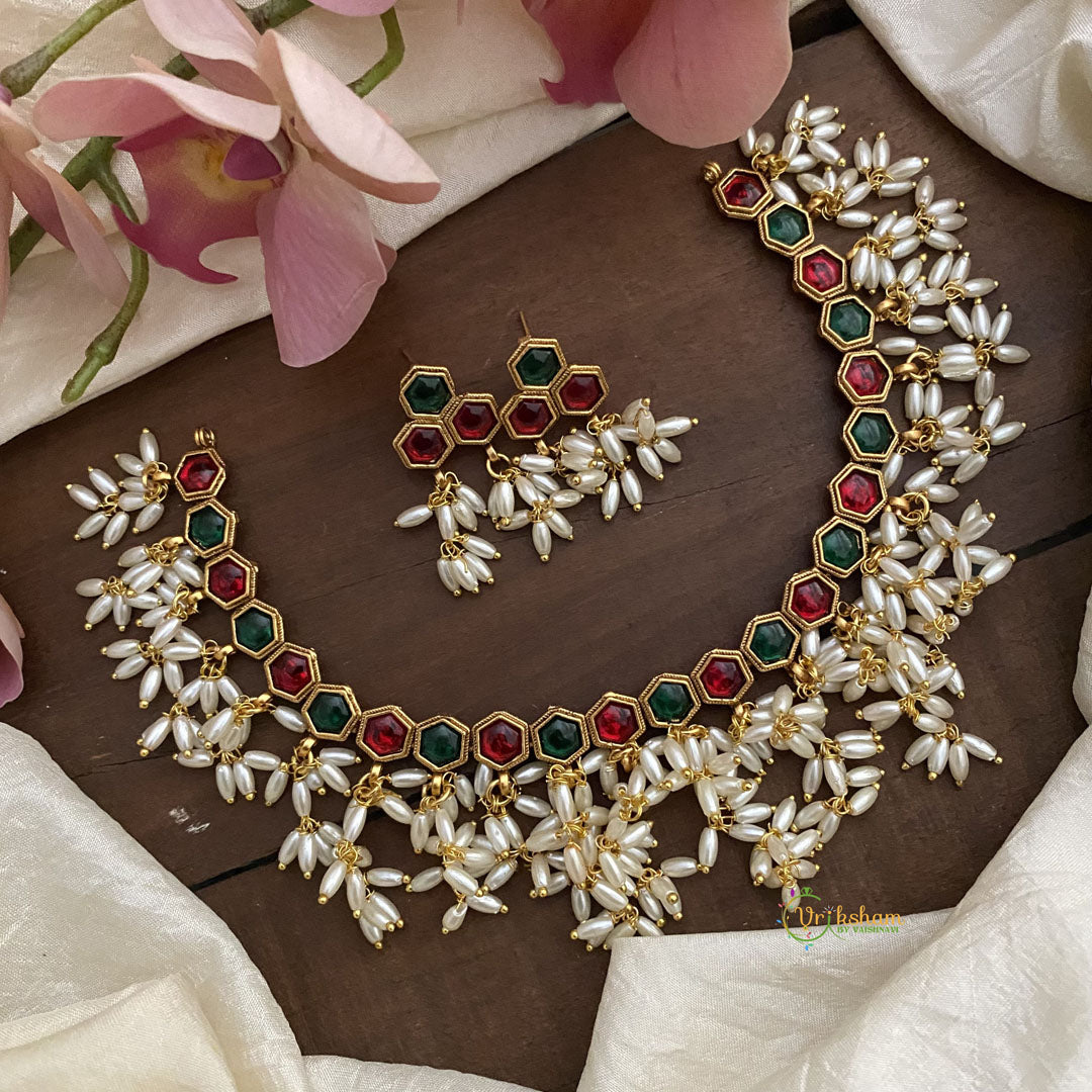 Indulge in luxury with our Premium Guttapusalu Short Neckpiece. Made with delicate rice pearls and accented with bold red and green stones, this necklace exudes elegance and sophistication. Elevate any outfit with this exclusive piece, perfect for those who appreciate the finer things in life. Comes with matching earrings.