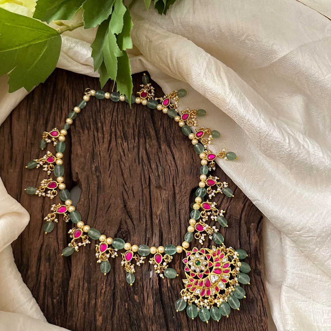 Make a statement with this elegant Premium Jadau Kundan floral chand Pendant Neckpiece, adorned with beads and pearls. The touch of red, green, and white kundan stones adds a beautiful pop of color. Elevate any outfit with this stunning, one-of-a-kind piece.