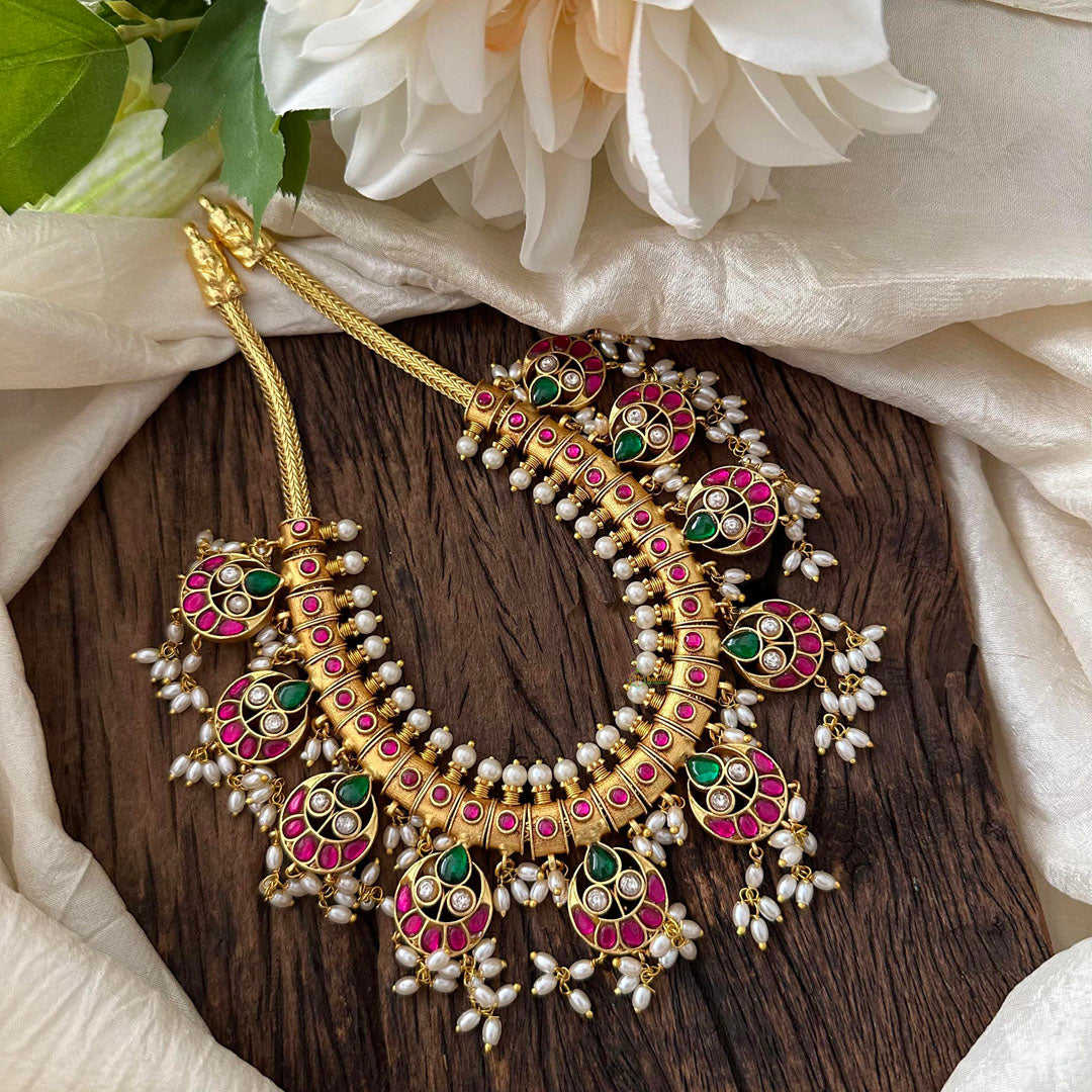 This stunning Premium Jadau Kundan Guttapusalu Haram is elegantly adorned with Rice Pearls and accented with red, green, and white precious kundan stones. Elevate your style with this exquisite piece, perfect for any special occasion.