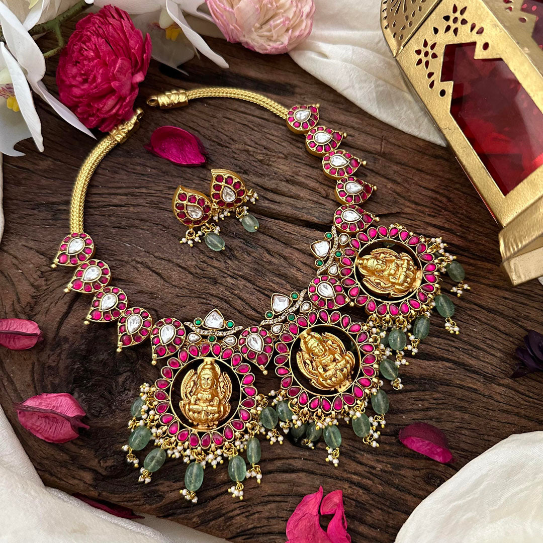 Indulge in luxury with our Premium Jadau Kundan Lakshmi Neckpiece. Handcrafted with exquisite Kundan and adorned with lustrous pearls and aqua green beads, this statement piece exudes elegance and opulence. Embrace the goddess within and elevate any ensemble with this exclusive neckpiece.