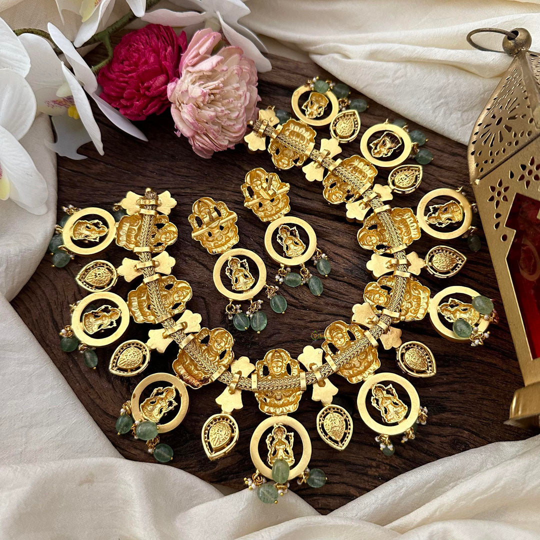 Indulge in luxury with our Premium Jadau Kundan Lakshmi Neckpiece. Adorned with beautiful pearls and aqua green beads, this exquisite piece exudes elegance and sophistication. Inspired by the goddess Lakshmi, it brings prosperity and abundance to any outfit. Elevate your style with this exclusive statement piece.