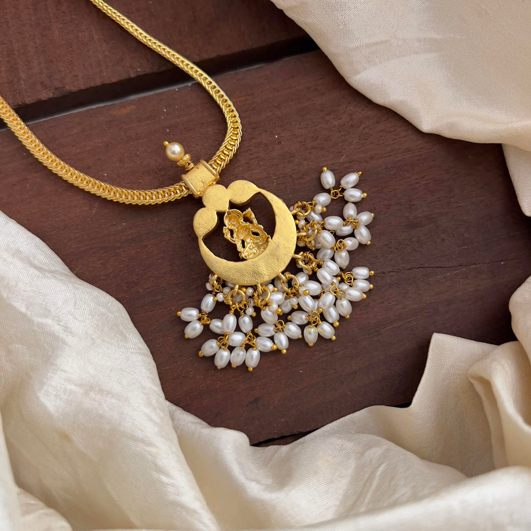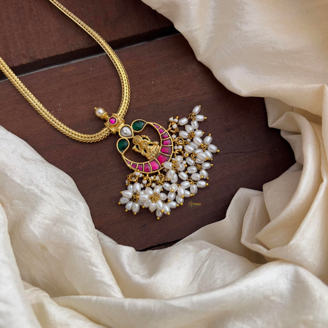 Indulge in the luxurious elegance of our Premium Jadau Kundan Lakshmi Pendant Chain-Rice Pearl. Adorned with intricate Jadau Kundan work and a stunning Rice Pearl pendant, this chain exudes sophistication and exclusivity. Elevate your style with this exquisite piece that will make you stand out from the crowd.