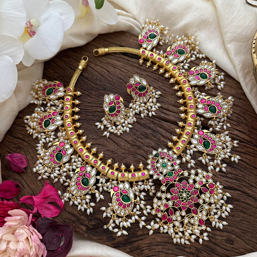 Indulge in pure luxury with our Premium Jadau Kundan Peacock Guttapusalu-Rice Pearl necklace. Crafted with exquisite Kundan and adorned with a stunning peacock design, this handcrafted piece is a true work of art. The delicate Rice Pearls add a touch of elegance, making it a must-have for any opulent occasion.