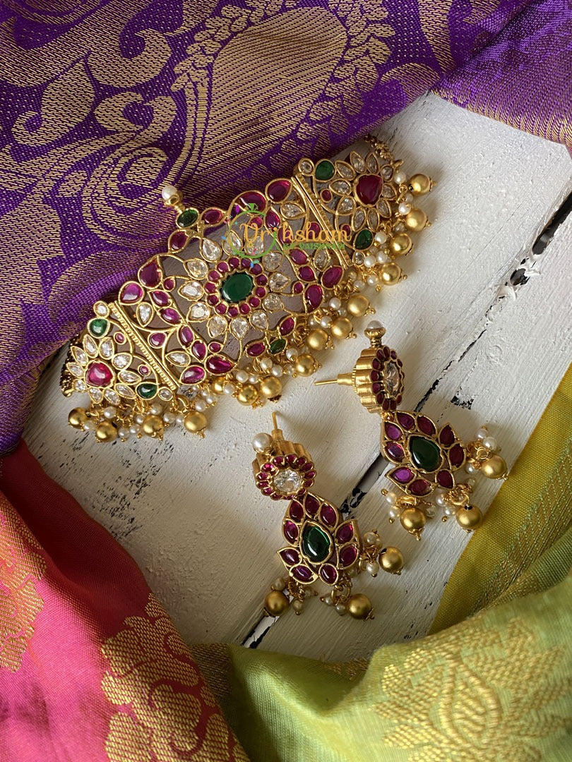 Premium Kemp High neck Choker -Red Green White - Gold look alike, floral pattern stone studded, pearl finish. Comes with a pair of earrings.