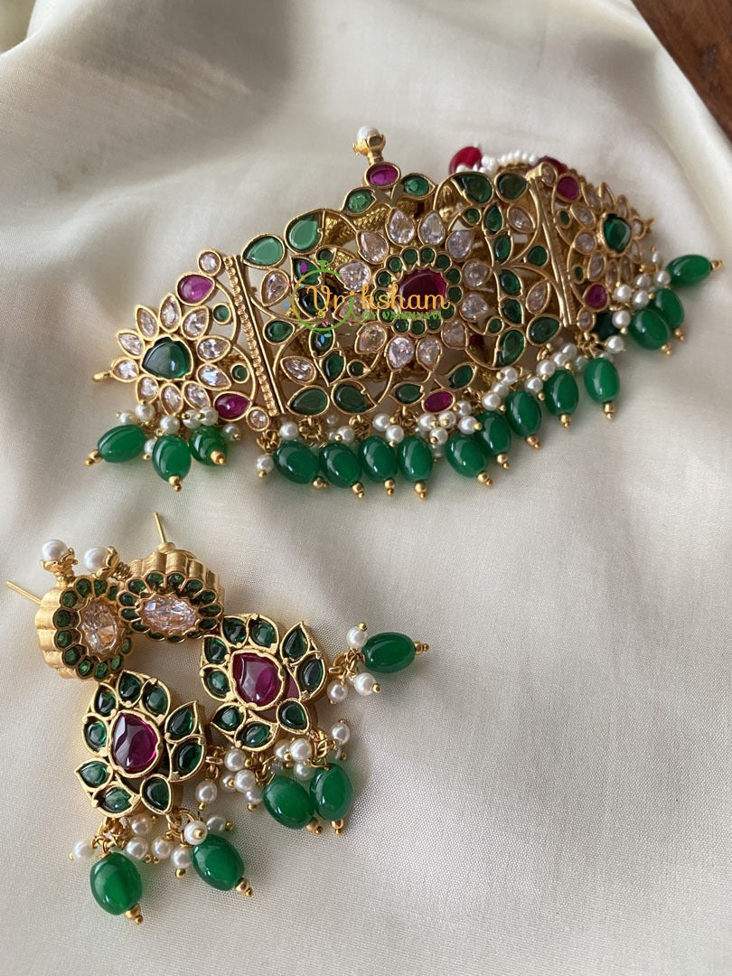 Premium Kemp High neck Choker -Centre red stone and green, red white – Gold look alike, floral pattern stone studded, pearl and Green bead finish. Comes with a pair of earrings.