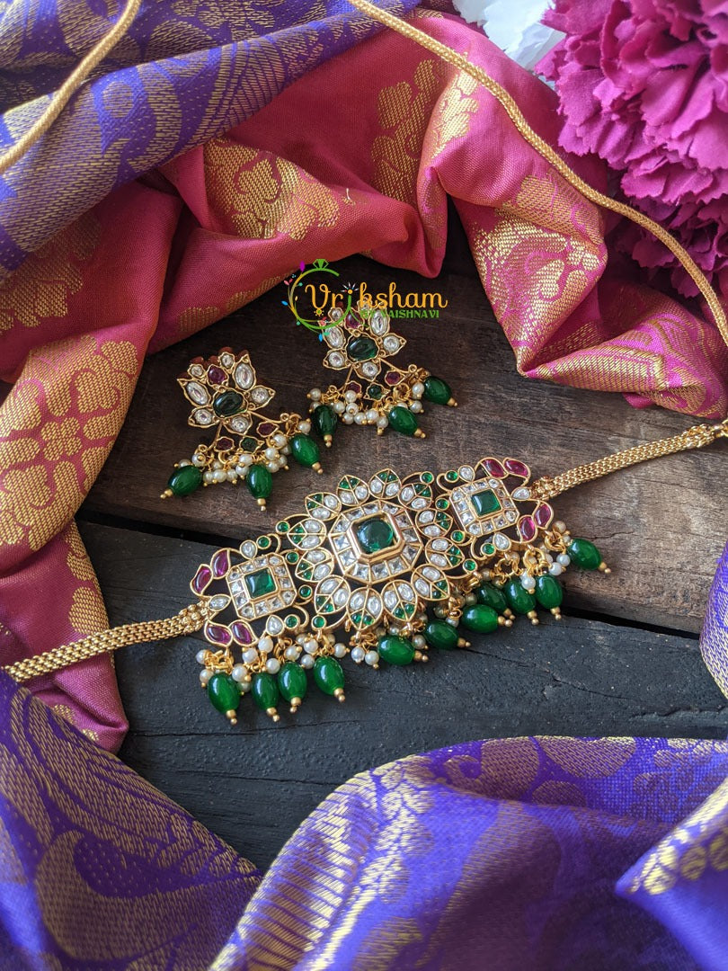 Premium Kemp High Neck Choker -Green and Red kemp; white AD stone studded premium quality high neck choker; Pearl & green bead finish. Comes with matching ear hangings.