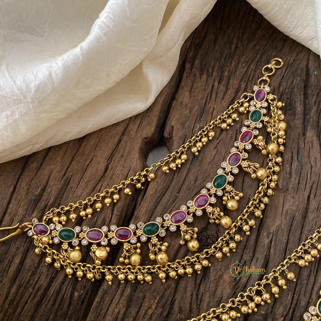 Premium Kemp Stone Maatil /Ear Chain-Red Green - The golden pearl layer maatil, also known as an ear chain, with golden pearls as well as precious red and green kemp stone interluded that adds grace and elegance to any attire.