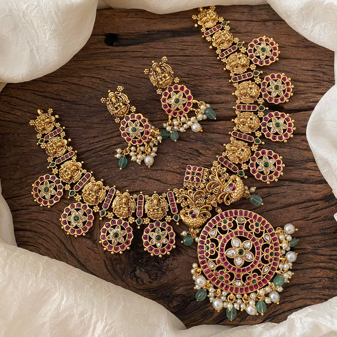 This stunning Premium Kemp Stone Pendant Short Lakshmi Haram is adorned with red, green, and white stones, adding a pop of color to your outfit. The aqua green Beads and white Pearls only add to the elegance of this piece. Elevate any look with this floral pendant and its intricately designed long haram