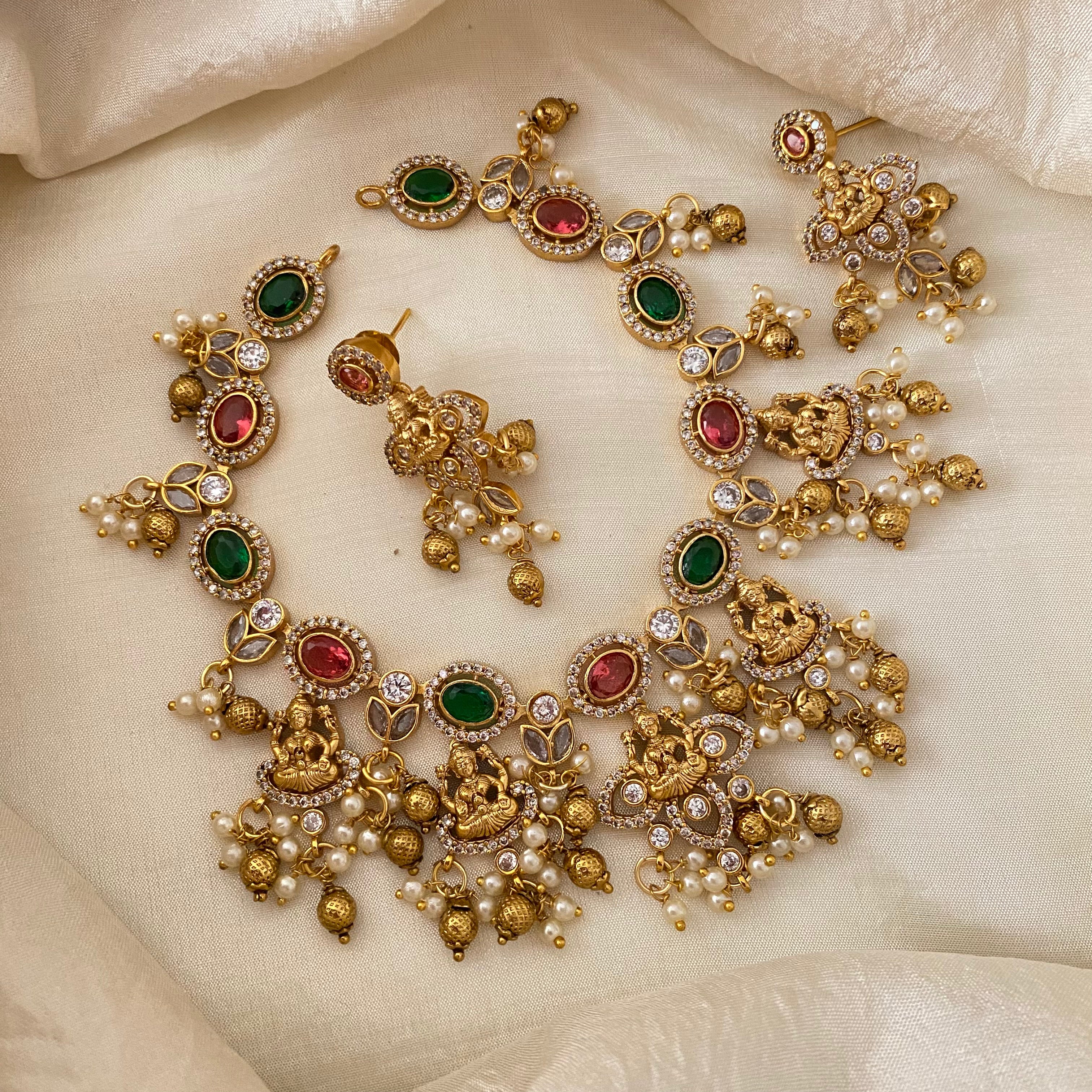 Premium Lakshmi AD Stone Short Neckpiece-Red Green- Premium gold look alike AD stone patterned hasli neckpiece with earrings.