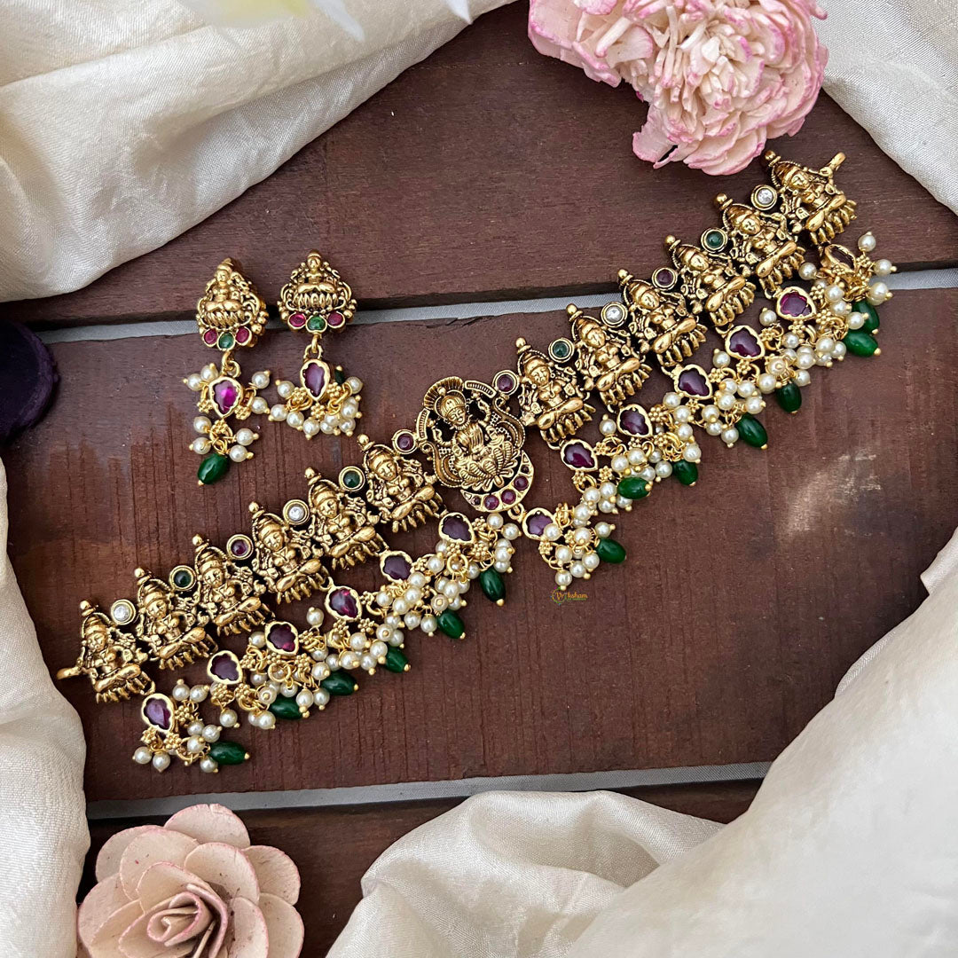 Indulge in the luxury of our Premium Lakshmi Choker necklace. Adorned with green beads and pearls, this exquisite piece exudes elegance and sophistication. Elevate your style and make a statement with this must-have accessory. Experience the allure of our exclusive collection.