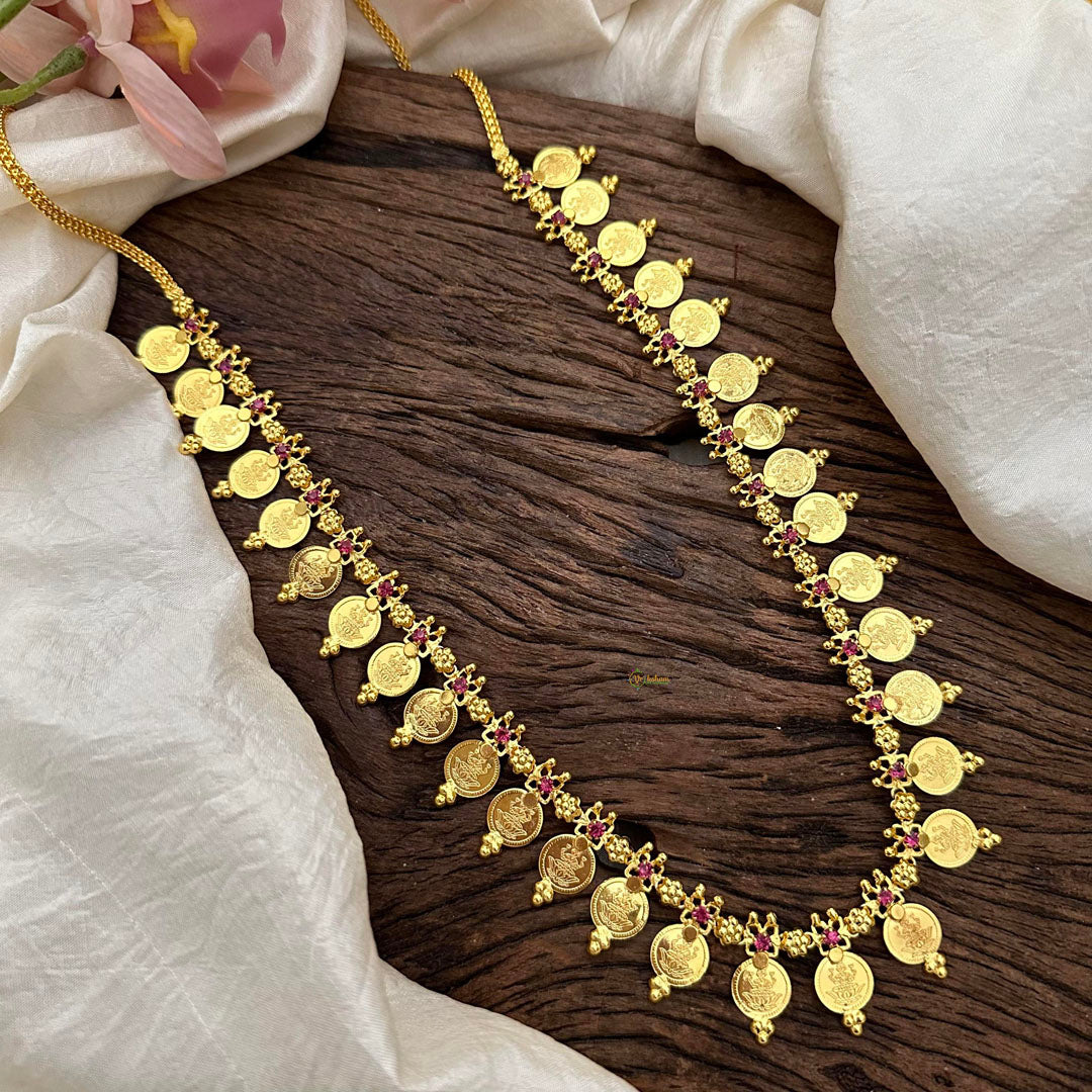 Elevate your style with our Premium Lakshmi Coin Kaasu Mala. Crafted with intricate detail, this necklace features authentic Lakshmi coins symbolizing wealth and prosperity. Adorn yourself with this timeless piece, perfect for any occasion. Experience luxury and elegance with the Lakshmi Coin Kaasu Mala.