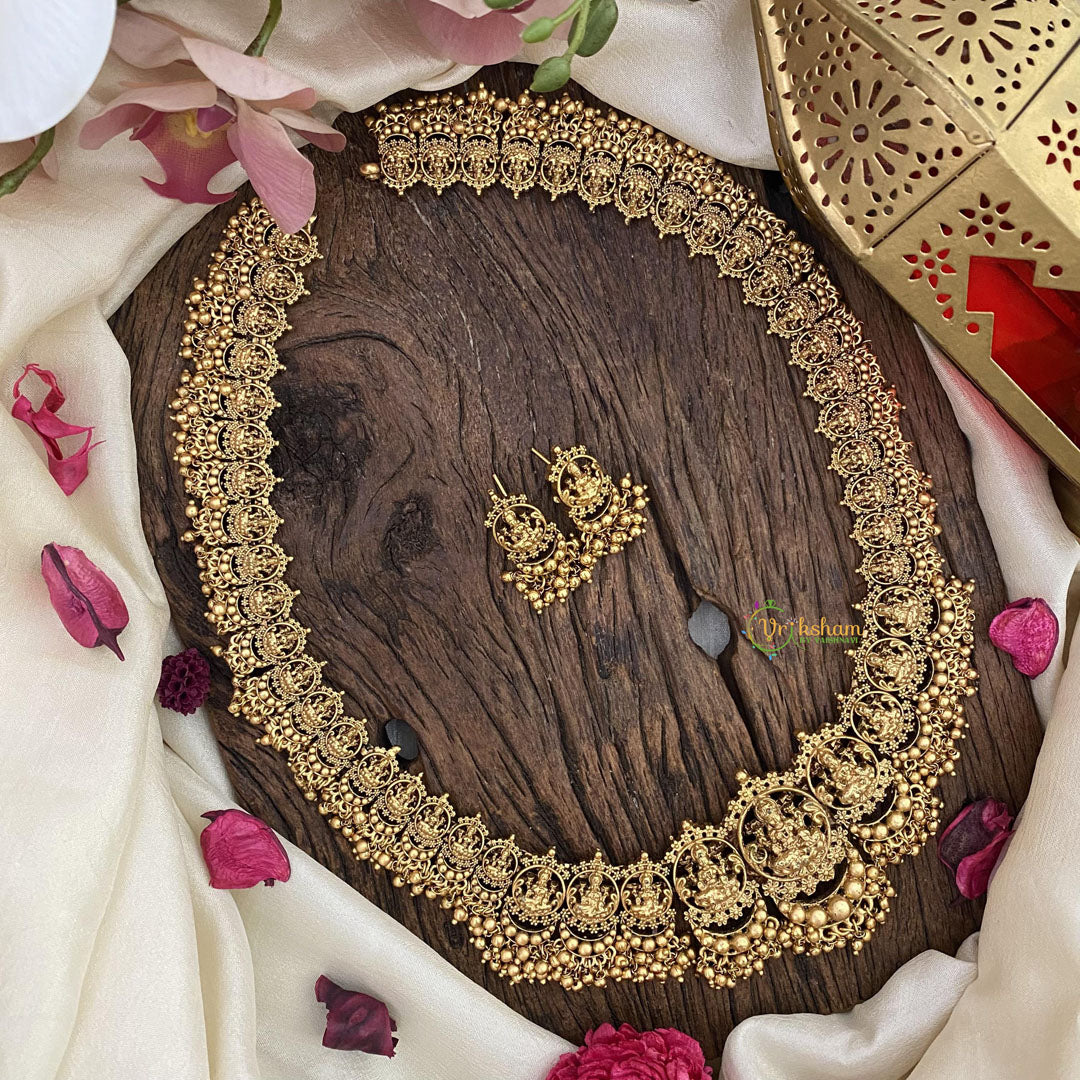 Premium Lakshmi Haram -Temple Haram -Lakshmi idols arranged in linear fashion with GHUNGROO FINISH, comes with matching studs.