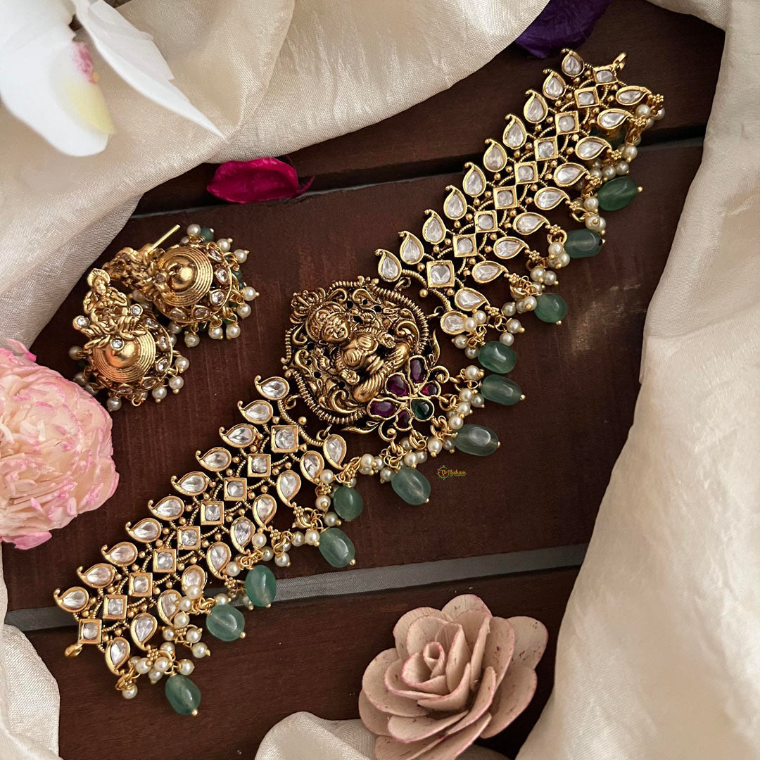 Elevate your style with our Premium Lakshmi High Neck Choker. Adorned with aqua green beads and pearls, this choker exudes luxury and sophistication. The high neck design adds an exclusive touch, perfect for making a statement at any occasion. Make a lasting impression with this exquisite piece.