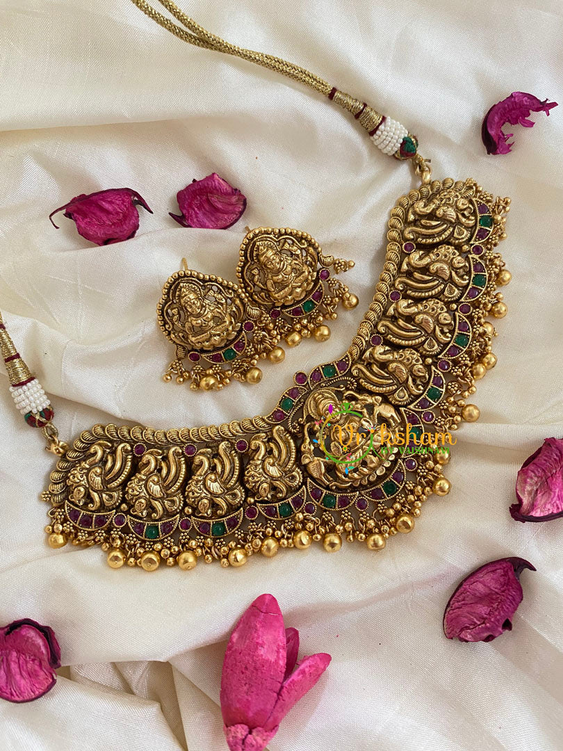 Premium Lakshmi High Neck Choker -Temple Choker - Red & green AD stone studded centre Lakshmi idol premium quality high neck choker; Gold bead finish. Temple make look. Comes with matching earrings.