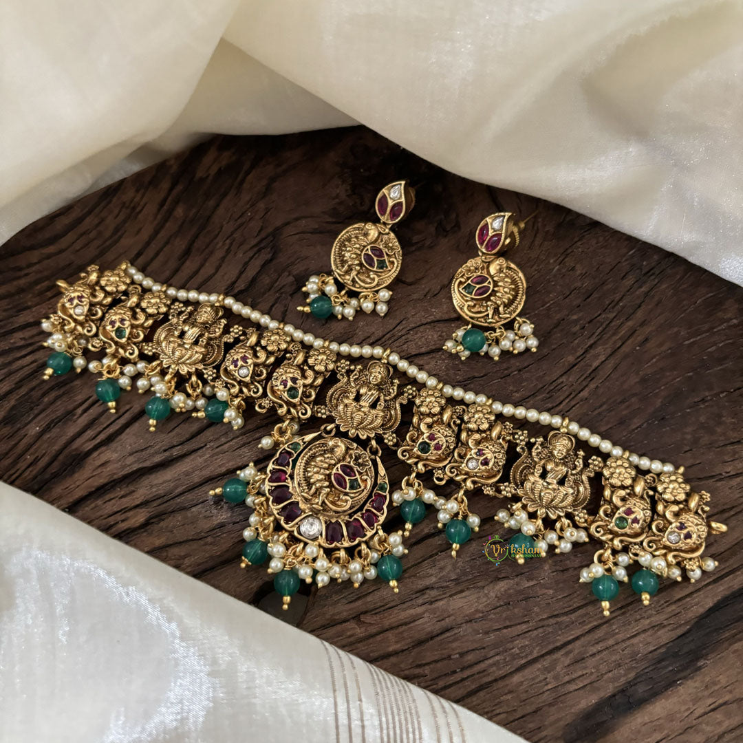 Premium Lakshmi High Neck Choker -Temple Choker - Red & white AD stone studded centre Lakshmi idol premium quality high neck choker; Green Bead finish. Temple make look. Comes with matching earrings.