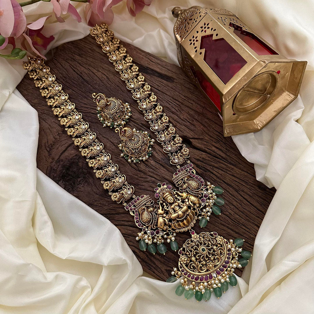 Indulge in luxury with our Premium Lakshmi Long Neckpiece. Adorned with aqua green beads and pearls, this statement piece exudes elegance and sophistication. Perfect for adding a touch of glamour to any outfit, it's a must-have for the fashion-forward individual. Elevate your style with our exclusive neckpiece.