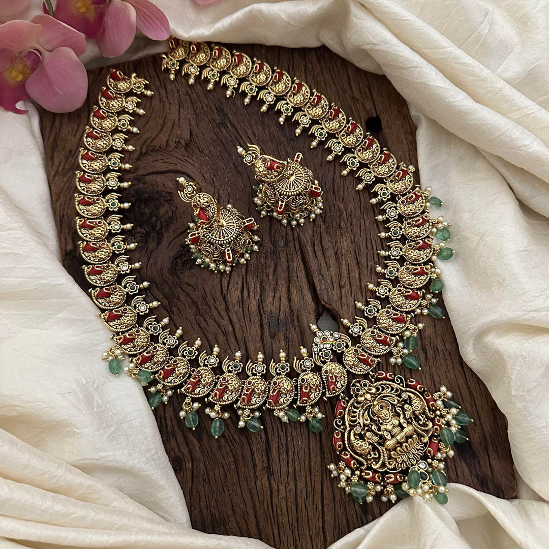 Experience the epitome of luxury with our Premium Lakshmi Long Neckpiece in a stunning pastel green color adorned with delicate beads and lustrous pearls. Elevate your style and exude elegance with this exquisite accessory. Comes with matching earrings.