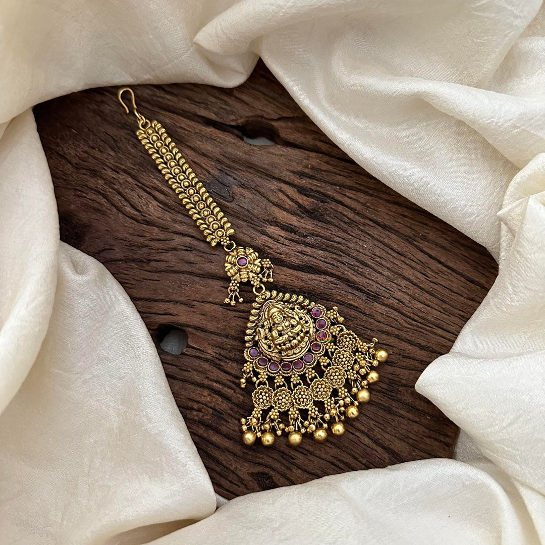 Enhance your traditional look with our premium Lakshmi Maang Tikka in red, and gold. Adorned with intricate gold beads, this piece represents beauty, grace, and auspiciousness. Elevate any outfit with this exclusive and luxurious accessory.