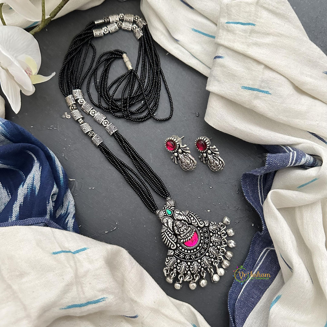 Embrace elegance with our Premium Lakshmi Mayil pendant necklace. Featuring a beautifully sculpted pendant inlaid with a striking black bead chain. Comes with matching earrings for a complete, sophisticated look. Perfect for adding a touch of luxury to any outfit.