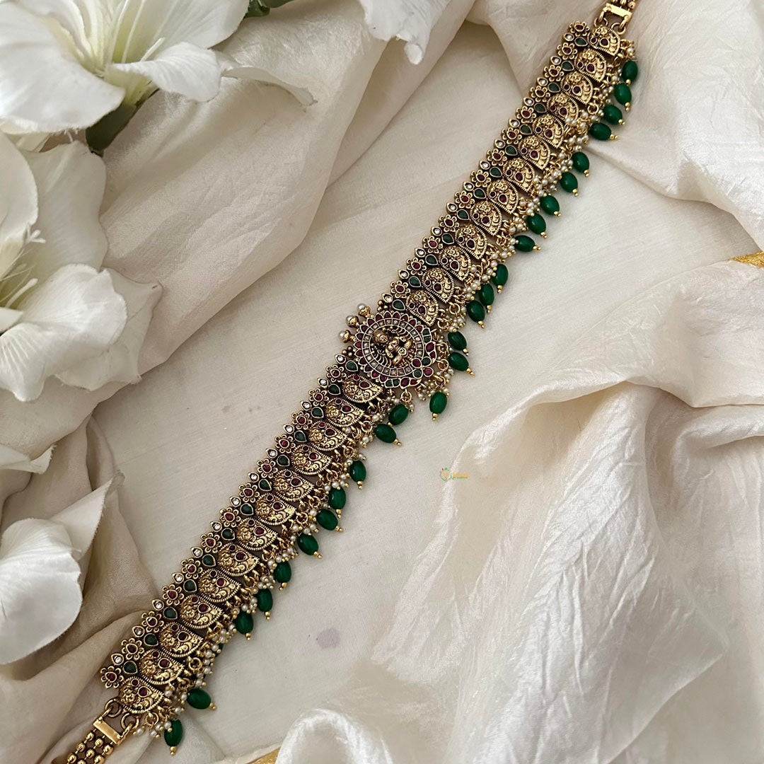 Premium Lakshmi Pendant Hip Chain-Green Beads - This premium Lakshmi pendant hip chain is designed with a single stan and features a beautiful peacock pattern with a floral design on both sides. Adorned with red, green, and white stones, as well as delicate green beads and pearls, this hip chain adds a touch of elegance and traditional charm to any outfit.