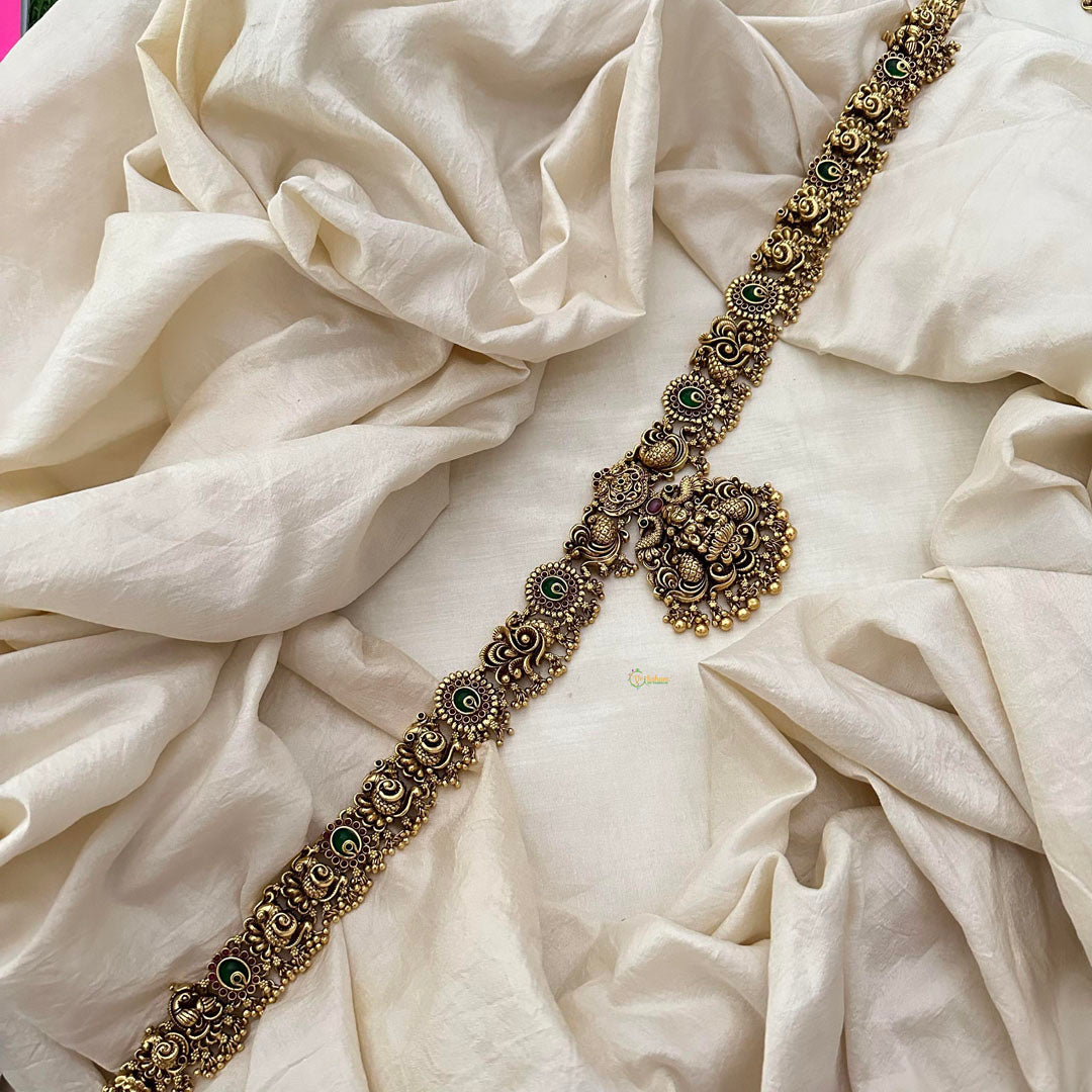 Introduce opulent elegance to your look with our Premium Lakshmi Pendant Peacock Chain Bridal Hip Chain. This exquisite piece features a striking Lakshmi pendant and intricate peacock chain, elevating any bridal ensemble. Slip it on for a touch of sophistication and alluring glamour.