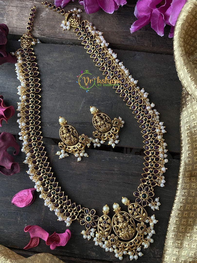 Premium Lakshmi Temple Haram - with Lakshmi Pendant iitation kemp studded linearly with pearls, comes with matching earrings.