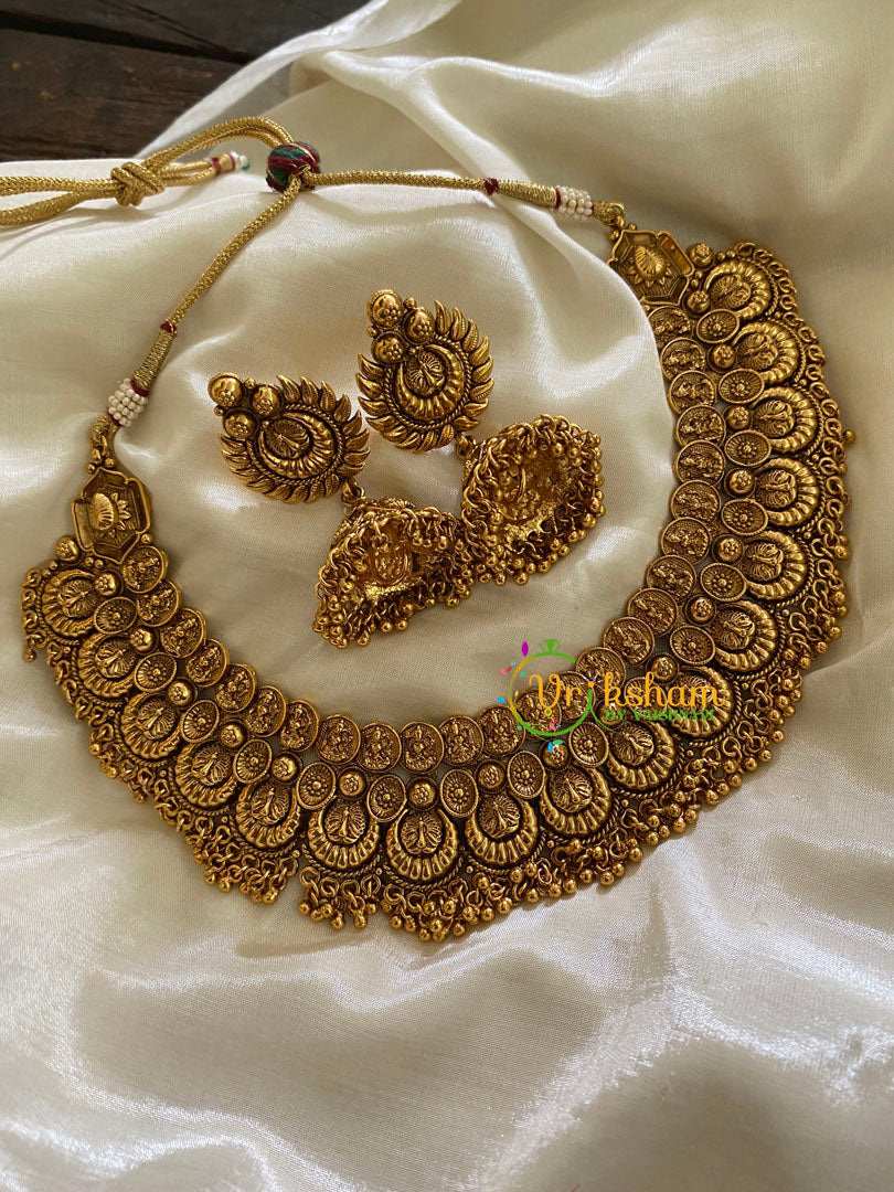 Premium Layered Coin Choker- Coin Choker - Temple Choker with Lakshmi and another layer of bigger peacock coins layer and heavy ghungroo finish, comes with matching ear hangings.