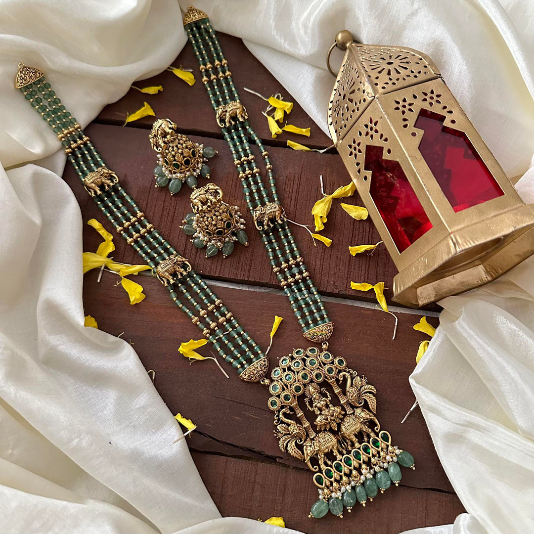 Add a touch of elegance to your style with our Premium Layered Temple Pendant Haram. Featuring aqua green beads and hints of green stones, this exquisite piece is a true work of art. The dual elephant and peacock design along with tiny pearls exude luxury and sophistication. Complete your look with the matching earrings.