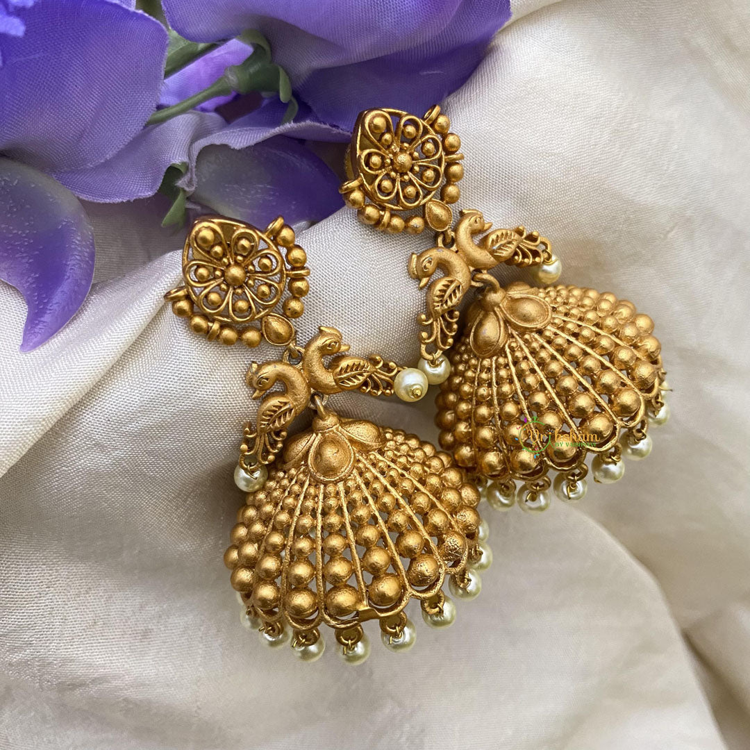 Add a touch of elegance to your ensemble with our Premium Matt Gold Alike Jhumkas-Pearls. These stunning earrings feature a dual peacock design, crafted from premium matt gold and adorned with lustrous pearls. Elevate your style with these exquisite jhumkas that are sure to turn heads.