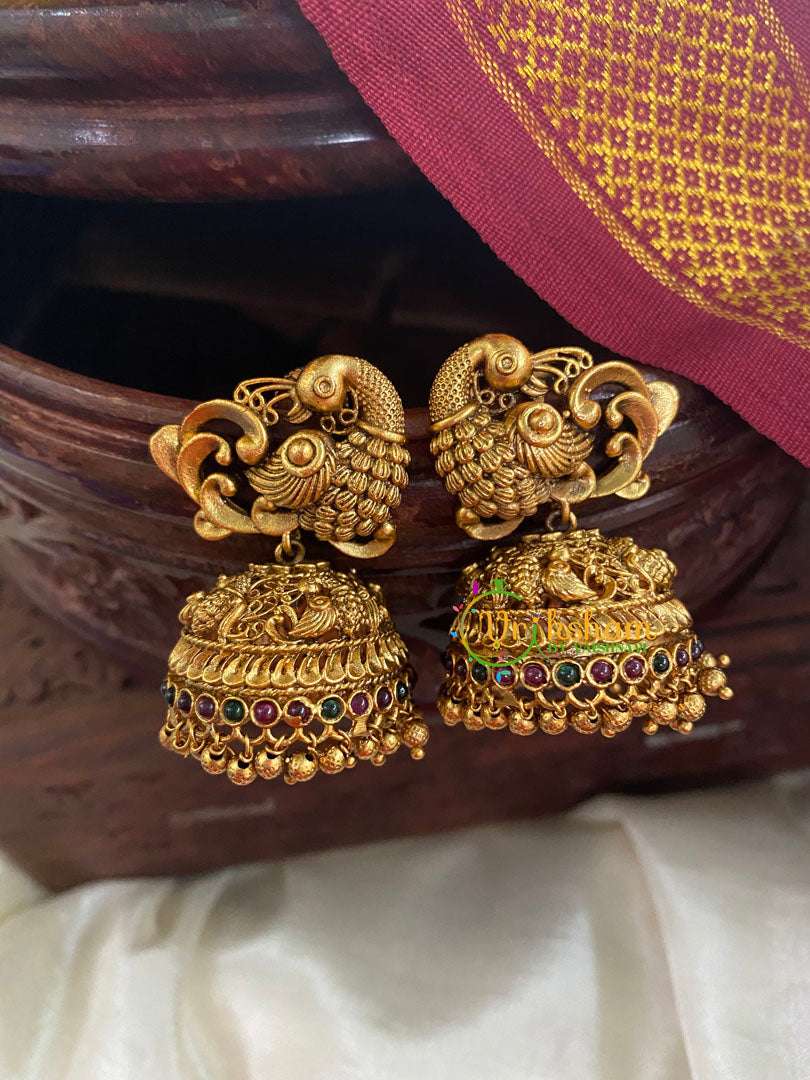 Premium Matt Peacock Jhumkas -Red Green regular stone studded peacock stud with golden ball finish.