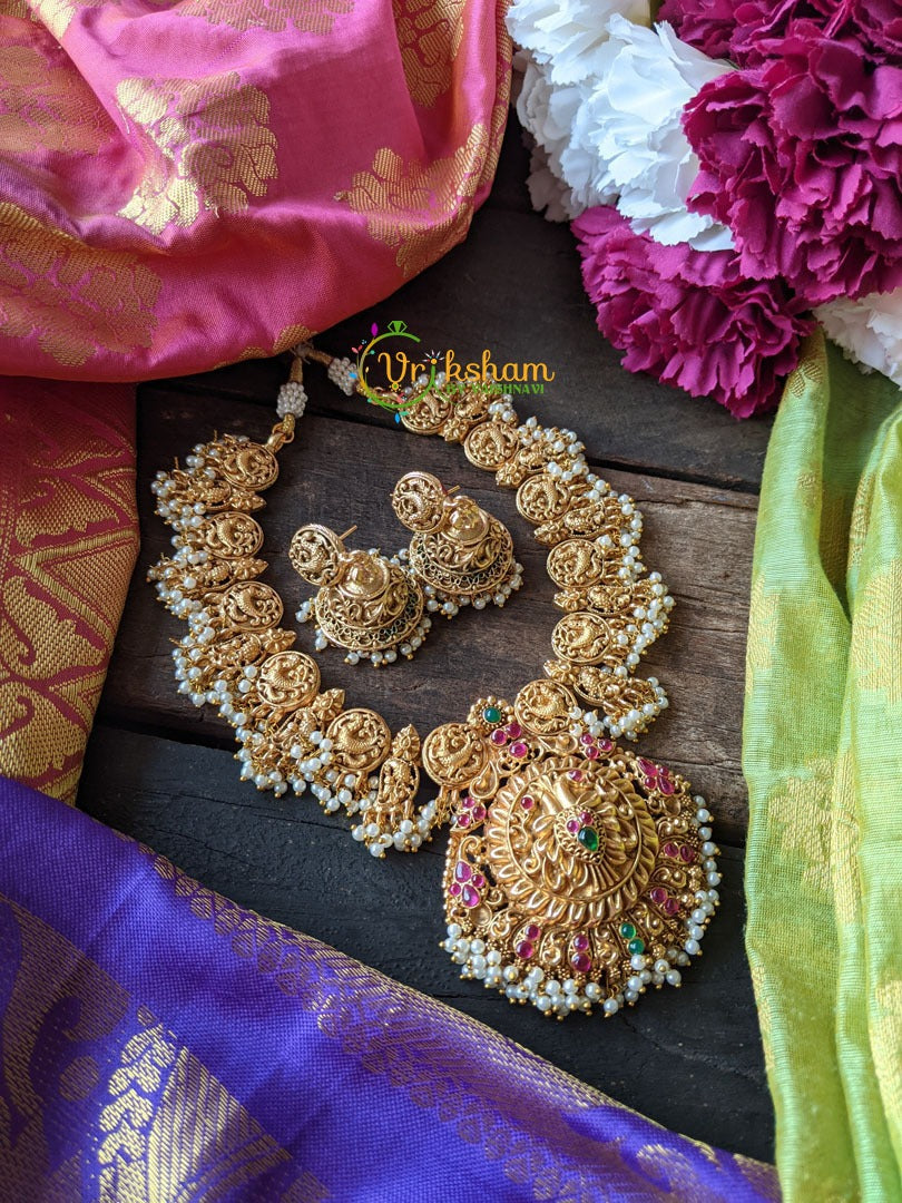 Premium Matt Pendant Choker Temple Neckpiece – premium quality short neckpiece , comes with kemp imitation stones in pendant. Guttapusalu style cluster pearl finish. comes with matching jhumkas.