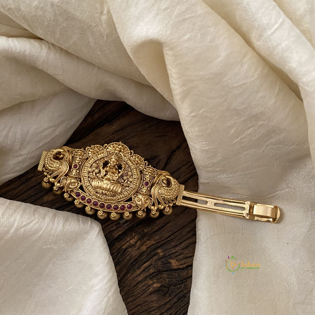 Premium Mayil Lakshmi Hairclip -Red- Gold Look Alike hair clip for festive braids and hairstyling, with gold bead finish and touch of red stones.