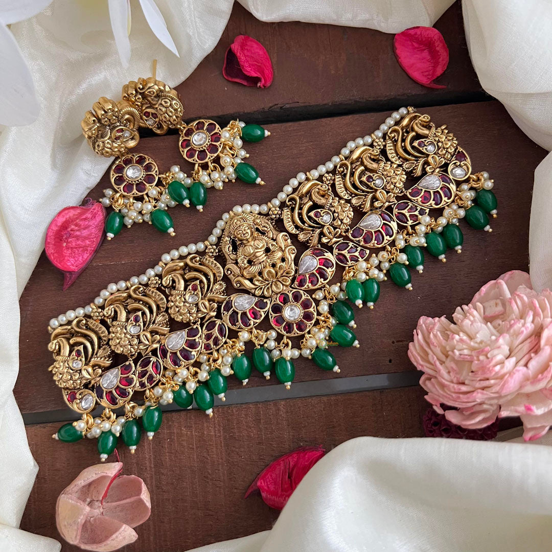 Indulge in luxury with the Premium Mayil Lakshmi High Neck Choker. The exquisite green beads and pearls add a touch of elegance to any outfit. This exclusive choker captures the grace and beauty of the Mayil Lakshmi motif, making it a timeless piece for your collection.