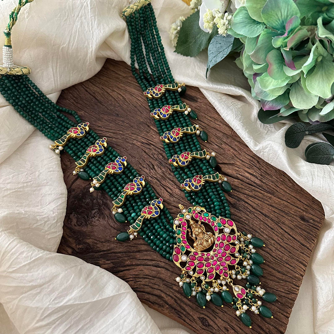 Make material : Premium Multilayer Kundan Jadau Lakshmi Pendant Haram- Green Beads- is made of Kundan Precious stones, temple make, artificial pearls, Copper and brass alloy.